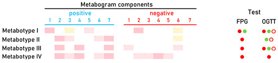 Main types of clinical blood metabograms (CBM) in patients with type 2 diabetes mellitus (DM) and prediabetes diagnosed by the presence of impaired glucose tolerance (IGT). Each row corresponds to the Z-scores of the metabogram components specific for the metabotype. ‘Positive’ values from 1 to 7 and ‘negative’ values from 1 to 7 correspond to two Z-score scales (see Section 2.3). Z-score is a measure of the metabogram components (from −1.64 to +1.64 is the normal range; up- and downregulation correspond to higher and lower Z-score values, respectively). Color coding: red indicates the upregulation of metabolites corresponding to the metabogram component; yellow indicates the downregulation of metabolites corresponding to the metabogram component; the shaded color refers to the metabogram components reflecting optionally up- or downregulated metabolites in DM. FPG, fasting plasma glucose; OGTT, oral glucose tolerance test; (●) FPG < 5.6 mmol/L and < 7.8 mmol/L in OGTT; (●) FPG > 5.6 mmol/L and > 11.0 mmol/L in OGTT; (○) glucose level between 7.8 and 11.0 mmol/L in OGTT.