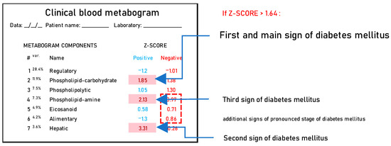 Summarizing the DM-associated changes in the CBM, it can be noted that they reflect the main currently known diabetic changes in blood metabolites. Therefore, the CBM can be considered a tool for a panoramic overview of diabetic blood changes, revealing their individual nature and severity. Based on the data obtained, it is possible to propose a DM signature in the CBM (Figure 7).
