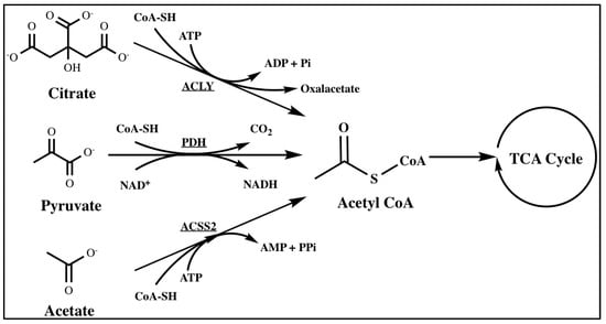 The synthesis of acetyl−CoA. Acetyl-CoA can be catalyzed from citrate, pyruvate, and acetate by ACLY, PDH, and ACSS2, respectively.