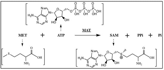 The synthesis of SAM. SAM is synthesized from methionine and ATP in a reaction catalyzed by methionine adenosyltransferase (MAT).