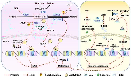 Schematic presentation of metabolic regulation of epigenetics in cancer. Metabolites such as acetyl-CoA and SAM play key roles in tumor progression, metastasis, and EMT through regulation of epigenetic modification.