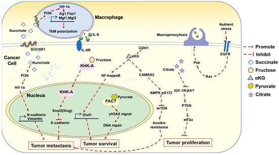 Schematic presentation of metabolic regulation of cell signaling in cancer. Metabolites such as succinate, fructose, αKG, pyruvate, and citrate play key roles in tumor metastasis, proliferation, and survival through regulation of cell signaling.