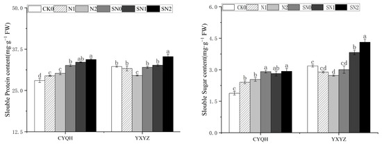 Effect of S-ABA on osmotic substances in rice under salt stress. CK0 (control treatment), N1 (50 mmol L−1 NaCl), N2 (100 mmol L−1 NaCl), SN0 (water + S-ABA spray at the stage of young panicle differentiation), SN1 (50 mmol L−1 NaCl + S-ABA spray at the stage of young panicle differentiation), SN2 (100 mmol L−1 NaCl + S-ABA). Different lowercase letters indicate significant differences between different treatments of the same rice variety (p ≤ 0.05).