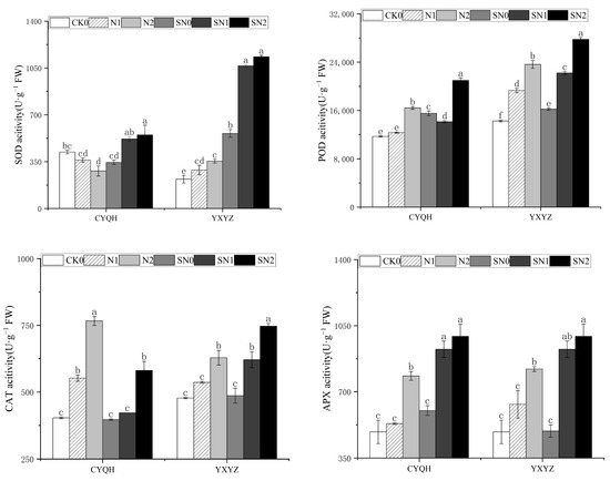 Effect of S-ABA on antioxidant enzyme activity in rice under salt stress. CK0 (control treatment), N1 (50 mmol L−1 NaCl), N2 (100 mmol L−1 NaCl), SN0 (water + S-ABA spray at the stage of young panicle differentiation), SN1 (50 mmol L−1 NaCl + S-ABA spray at the stage of young panicle differentiation), SN2 (100 mmol L−1 NaCl + S-ABA), Different lowercase letters indicate significant differences between different treatments of the same rice variety (p ≤ 0.05).