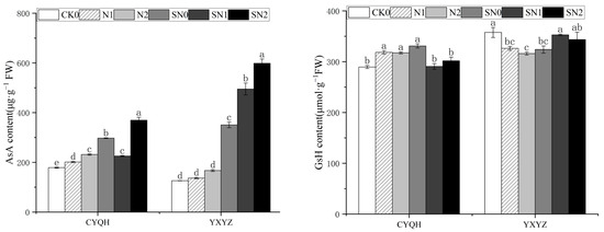 Ascorbic acid (AsA) levels were determined using methods described by Altaf [26] with minor modifications. The absorbance was measured at 534 nm. The GsH content was determined as described by Khairiah Mubarak Alwutayd [27] with minor modifications. The reaction mixture consisted of 200 µL of supernatant, 2.6 mL of acetate buffer (0.2 M, pH 5.6), and 200 µL of 5,5-disulfuric acid-(2-nitrobenzoic acid). Samples were stored at 30 °C for 10 min. The absorbance of GsH was measured at 412 nm.