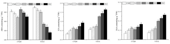 Effect of S-ABA on endogenous hormone content in rice under salt stress. CK0 (control treatment), N1 (50 mmol L−1 NaCl), N2 (100 mmol L−1 NaCl), SN0 (water + S-ABA spray at the stage of young panicle differentiation), SN1 (50 mmol L−1 NaCl + S-ABA spray at the stage of young panicle differentiation), SN2 (100 mmol L−1 NaCl + S-ABA). Different lowercase letters indicate significant differences between different treatments of the same rice variety (p ≤ 0.05).