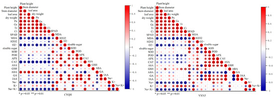 To more effectively identify the correlation between these traits, a Pearson correlation analysis was performed for 25 representative traits (Figure 7). For the Chaoyou 1000 variety, there was a significant positive correlation between agronomic traits and photosynthetic parameters. There was also a positive correlation between agronomic traits, photosynthetic parameters, and endogenous hormone ABA content, and a significant positive correlation between photosynthetic parameters and K+ content. SP, SS, POD, APX, ASA were significantly positively correlated with GA and IAA. Agronomic traits and photosynthetic parameters were significantly negatively correlated with MDA, O2−, CAT activity, NA+ and Na+/K+.