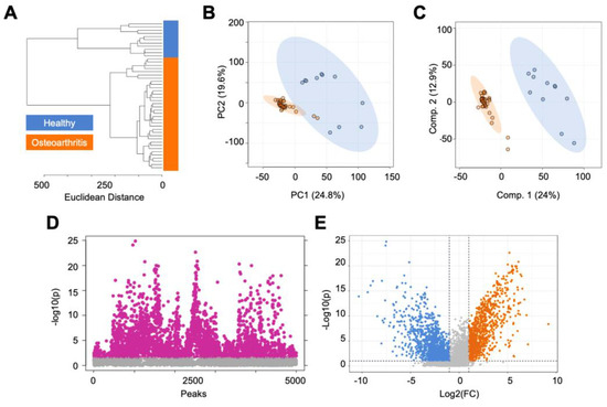 The metabolomic profiles of human cartilage from healthy and osteoarthritis patients are metabolically distinct. (A) Hierarchical clustering analysis found that healthy and osteoarthritic cartilage samples cluster separated from each other. (B) Principal component analysis, an unsupervised test, found a minimal overlap of principal components 1 and 2, accounting for 44.4% of the variability in the dataset. (C) Partial least-squares discriminant analysis, a supervised test, showed complete separation of healthy and diseased cartilage samples, with components 1 and 2 accounting for 36.9% of the variability in the dataset. (D) T-test analysis detected 2842 metabolite features, with a false discovery rate-adjusted p-value less than 0.05. (E) Volcano plot analysis, using fold change and statistical significance, distinguished differentially regulated metabolites between healthy and diseased cartilage. Specifically, 1010 metabolite features were more abundant in diseased cartilage compared to healthy cartilage (log2(FC) > 2, p < 0.05), whereas 1399 were more abundant in healthy cartilage compared to diseased cartilage (log2(FC) < −2, p < 0.05). Orange = osteoarthritis. Blue = healthy.