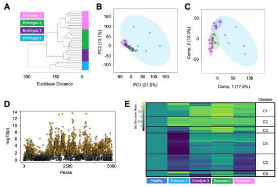 Once the endotypes were distinguished and patient-specific factors were examined, we used PCA and PLS-DA to gain additional insight into these endotypes. This revealed a limited overlap between the endotype groups (Figure 2B,C). Notably, endotype 4 exhibited considerable variability, portrayed by a substantial ellipse. In contrast, endotypes 1–3 showed a closer metabolomic resemblance, where proximity of smaller and tighter clustered ellipses was observed. The subsequent ANOVA analysis identified 2506 metabolite features that were significantly different between endotypes, with FDR-corrected p < 0.05 (Figure 2D). This subset of features was then matched to putative identifications made using the LC-MS/MS data. The identifications consisted of lipid and lipid-like metabolites including cervonyl carnitine, lucidenic acid A, 6-epi-7-isocucurbic acid glucoside, various phosphatidylcholine species, and others (Supplemental Figure S3A, Supplemental Table S5). Additionally, metabolites related to arachidonic acid and leukotriene metabolism were identified, including arachidonic acid, panaxydol linoleate, leukotriene F4, and N-acetyl-leukotriene E4 (Supplemental Figure S3B, Supplemental Table S5).