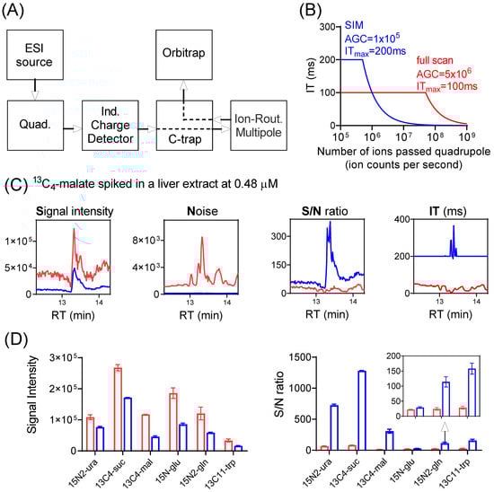 SIM improves signal-to-noise (S/N) ratio for low-abundance ions. (A) Major components of Exploris Orbitrap instrument. (B) Calculated ion-injection time (IT) as a function of the number of ions passed through the quadrupole (ion counts per second), for SIM with automatic gain control (AGC) target of 1 × 105 and ITmax of 200 ms (blue trace), and full scan with AGC target of 5 × 106 and ITmax of 100 ms (red trace). Note the IT is capped at ITmax. (C) Nominal signal (ion counts per second, cps; note that actual ions detected = nominal signal x injection time), noise (N), signal-to-noise (S/N) ratio, and injection time (IT) for the detection of spiked 13C4-malate (m/z 137.0277 ± 5 ppm) in a mouse-liver extract using SIM (blue trace) and full scan (red trace). Note that when SIM scans were performed in multiplex mode, the actual IT for individual SIM may exceed the ITmax (Table S2). See Supplementary Materials for details. (D) Signal intensity (cps) and S/N ratio for the six isotope-labeled standards spiked into a mouse-liver extract at low concentrations (Table S2), using SIM (blue bar) and full scan (red bar), respectively.