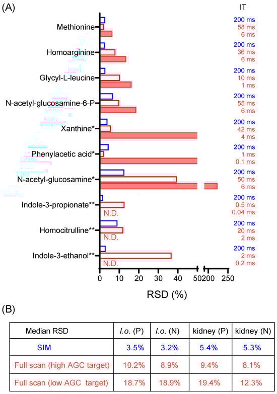 SIM enables detection and quantitation of low-intensity ions. (A) Relative standard deviation (RSD) for the signal intensity of 10 low-intensity metabolites from a yeast extract (I. orientalis = I.o.) in positive mode from five LC-MS runs of the same sample, using SIM or full scan with high AGC target of 1 × 107 or full scan with low AGC target of 1 × 106. *: metabolites detected in fewer than five measurements for full scan with low AGC target. **: metabolites not detected (N.D.) in any of the five measurements for full scan (low AGC target). (B) Summary of median RSD for 10 low-intensity metabolites for a yeast extract and a mouse-kidney extract, in positive (P) and negative mode (N), respectively. Data excludes those cases where RSD is not available (due to metabolites not being detected). Full data is presented in Table S3.