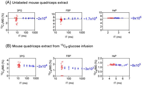 Mouse quadriceps muscles were collected from male wild-type C57/BL6 mice (12 weeks old) that either did or did not receive an infusion of 400 mM [U-13C] glucose at a rate of 0.1 μL per minute per gram body weight for 3 h and were flash-frozen in liquid nitrogen [19]. Extracts were then prepared as above, and analyzed in negative mode focusing on the three glycolysis intermediates: 3-phosphoglycerate (3PG), hexose 6-phosphate (HxP), and fructose 1,6-bisphosphate (FBP) (Table S4). The SIM parameters are (with varying ITmax to test the importance of this parameter) the following: