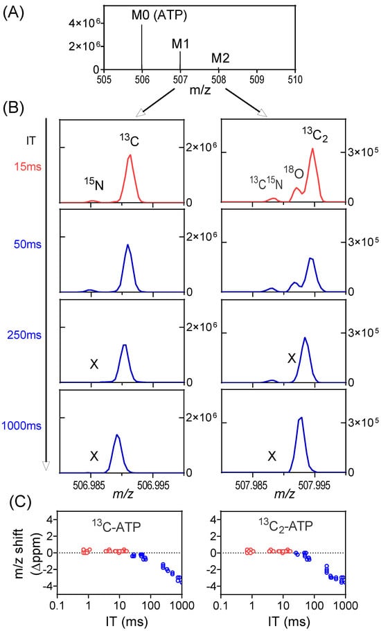 The other consequence relates to the mass accuracy. With high numbers of ions in the orbitrap, the ion motion trajectory of individual ions is more likely to be affected by nearby ions (particularly those of the same m/z or similar m/z), resulting in worse mass accuracy. In the worst case, two ions with similar m/z may merge as a single peak on the mass spectrum, a phenomenon known as ion coalescence [37,38,39,40,41,42]. While SIM may improve signal-to-noise ratio, the high number of ions in a narrow m/z range also make it more prone to ion coalescence. As an example, we examined the labeling of ATP from a mouse tumor when infused with 13C-formate (Figure S7). The primary ions of interest are 13C1-ATP (with 15N-ATP nearby) and 13C2-ATP (with 13C15N-ATP and 18O-ATP nearby, Figure 4A). For the full scan (m/z 70–1000), the IT is brief (~15 ms) as the AGC target is quickly reached, and all ions of interest are resolved. They are also resolved for SIM when the IT is capped by the user at 50 ms (ITmax = 50 ms). When IT increases to 250 ms, 15N-ATP merges with 13C-ATP and 18O-ATP merges with 13C2-ATP (Figure 4B). When IT reaches 1000 ms, the 13C15N-ATP also merges with 13C2-ATP. Overall, there is a downward shift in the mass of 13C-ATP and 13C2-ATP with increasing IT in SIM as a result of ion coalescence (Figure 4C). The merging of multiple peaks with similar m/z will result in incorrect isotope-ratio measurements [43]. To obtain correct isotope enrichment, here, ITmax is set at 50 ms for SIM (Figure S8). The key message is that a longer injection time allows more ions to accumulate and increases the S/N ratio, but it can also result in increased risks of the space-charge effect and ion coalescence. Consequently, selecting the optimal ITmax value is important to strike a balance between sensitivity and accuracy.