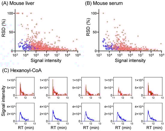 Combining SIM with a full scan provides more accurate metabolome quantitation. (A) Plot of RSD for 872 metabolites (>400 each in positive + negative mode, red dots) detected in full scan, and 75 metabolites in SIM (blue dots) from a mouse-liver extract. RSD increases with decreasing signal intensity in the full scan and SIM lowers RSD for low-intensity ions. Complete data are provided in Table S7. For metabolites with RSD >100%, RSD was plotted as 100% for visualization purposes. (B) Similar results for serum (482 total metabolites in full scan, positive + negative mode, red dots) with 49 SIM (blue dots). (C) Extracted ion chromatograms for hexanoyl-CoA (m/z 866.196 ± 10 ppm in positive mode, RT 11.45 min) in full scan (red trace) and SIM (blue trace) from five LC-MS runs of the same mouse-liver extract. The injection times are 1 ms for full scan and 30 ms for SIM at 11.45 min.