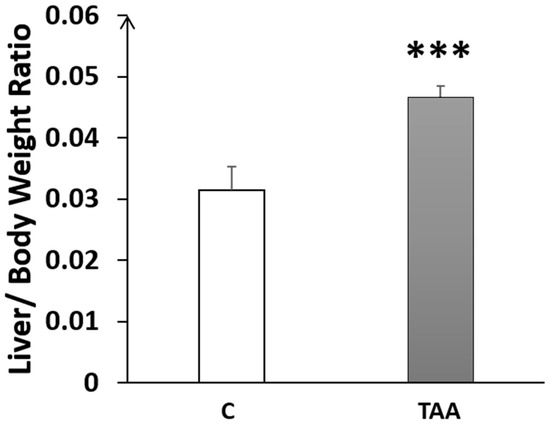 Histogram showing the liver-to-bodyweight ratio (LBWR) in the control (C) and TAA groups. *** p < 0.001 vs. control.