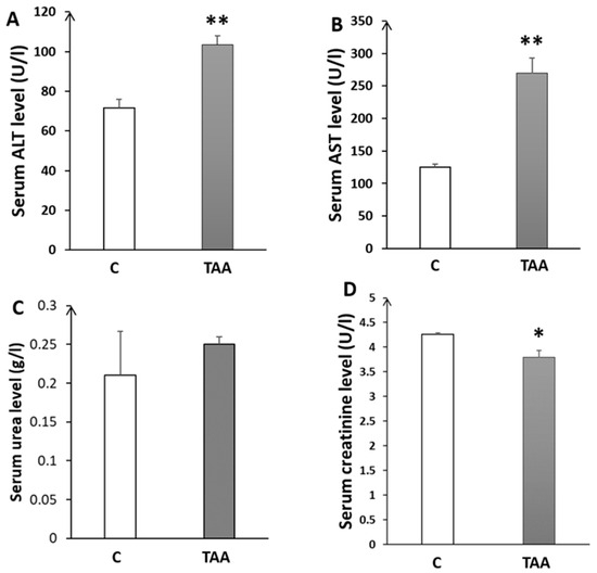 Histograms showing biochemical serum levels in the control (C) and TAA groups: (A) alanine aminotransferase; (B) aspartate-aminotransferase; (C) urea; and (D) creatinine. * p < 0.05, ** p < 0.01 TAA vs. C.