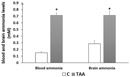 Previous reports of this animal model have described: hepatic damage (increased blood levels of alanine aminotransferase and aspartate aminotransferase), histopathological changes in the liver, alterations in brain biochemical parameters (increase in neuronal nitric oxide synthase, NADPH oxidase activity, over-activation of glucose-6-phosphate dehydrogenase, and a decline in phosphofructokinase-2), and behavioral abnormalities characteristic of Type C HE [36,39,40,41]. We further characterized this model and found liver and brain morphological changes (i.e., liver sections from TAA-treated rats showed ballooning degeneration, hydropic changes, and the presence of eosinophilic bodies affecting approximately 60–70% of the liver parenchyma, predominantly in periportal regions). We also found increased blood and brain ammonia levels (two- to three-fold). Ammonia levels in the blood and brain tissue of these rats were comparable with those found in rats after portocaval anastomosis [42,43,44].