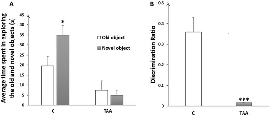 Histogram showing the average time spent in exploring the old and the novel objects (A); and the discrimination ratio (B) in the control (C) and TAA groups., * p < 0.05, *** p < 0.001 vs. control.