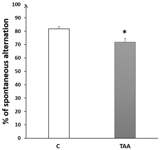 The percentage of alternation behavior in the Y-maze was significantly reduced (p < 0.05, Figure 6) in TAA-treated rats, as compared to the controls.