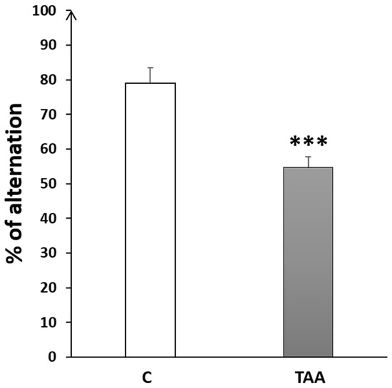 The percentage of alternation in the T-maze test was significantly decreased (p < 0.001, Figure 7) in the TAA group compared to the controls.
