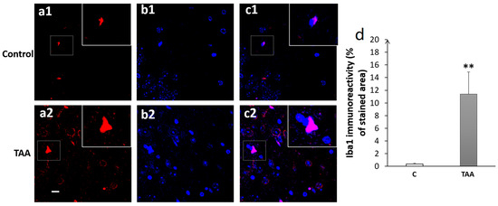 Photomicrographs of the CA1 hippocampal slides immuno-stained with anti-Iba1 (a1,a2) or anti-DAPI (b1,b2) and the merged (c1,c2). (a1–c1) (controls), (a2–c2) (TAA). (d): Iba1 immunoreactivity (% of stained area as well as number of cells). Scale bar = 35 µm. ** p < 0.01 vs. control.