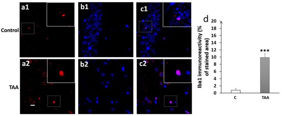 Photomicrographs of the DG hippocampal slides immuno-stained with anti-Iba1 (a1,a2); anti-DAP (b1,b2); and merged (c1,c2). (a1–c1) (controls), (a2–c2) (TAA). (d) Iba1 immunoreactivity (% of stained area and number of cells). Scale bar = 35 µm. *** p < 0.001 vs. control.