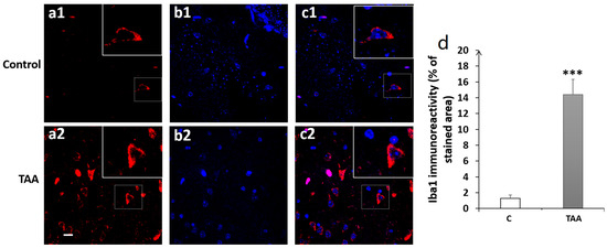 Photomicrographs of the CA3 hippocampal slides immuno-stained with anti-Iba1 (a1,a2); anti-DAPI (b1,b2); and merged (c1,c2). (a1–c1) (controls), (a2–c2) (TAA). (d) Iba1 immunoreactivity (% of stained area as well as number of cells). Scale bar = 35 µm. *** p < 0.001 vs. control.