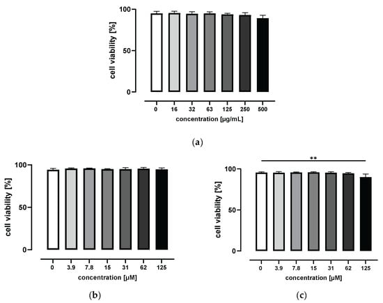 Effect of grape/blueberry anthocyanins and their gut-derived metabolites on THP-1 cell viability. THP-1 monocytes were incubated with the indicated concentrations of (a) the GBE, (b) HVA, or (c) THBA for 24 h before cell viability was measured by flow cytometry. Data are presented as mean ± SD (n = 3). Significant differences compared to the untreated control were calculated using one-way ANOVA followed by Dunnett’s multiple comparisons test. ** p < 0.01.