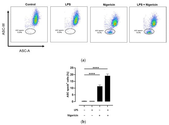 ASC speck formation is a hallmark of NLRP3 inflammasome activation. While under resting conditions ASC molecules are diffuse distributed in the cytoplasm, NLRP3 inflammasome activation leads to the formation of a single supramolecular ASC speck. This condensation of ASC molecules could be observed using flow cytometry as a decline in ASC pulse width (ASC-W) []. Therefore, the quantification of ASC speck-positive cells using flow cytometry is a sensitive method to determine NLRP3 inflammasome activation on a cellular level []. To validate this method, THP-1 monocytes were either left untreated or primed with LPS followed by activation of the inflammasome with the pore-forming toxin nigericin []. As expected, no formation of ASC specks could be observed in untreated and LPS-treated THP-1 monocytes. In contrast, nigericin treatment with and without prior LPS priming resulted in a significant increase of ASC speck-positive cells compared to the untreated control (p < 0.0001; Figure 2).