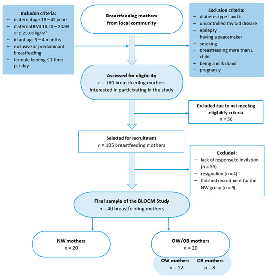 This case–control BLOOM (Breastmilk and the Link to Overweight/Obesity and Maternal diet) study was conducted between October 2022 and April 2023 among 40 mothers who exclusively or predominantly breastfed for 15.5 ± 1.2 weeks. The study group was divided into two groups: those with a normal body mass index (BMI, 18.50–24.99, kg/m2; NW group) and those with overweight or obesity (BMI, ≥25.00, kg/m2; OW/OB), according to the WHO criteria [20]. Participants were recruited through convenience sampling from the local community using social media groups, and were selected based on inclusion and exclusion criteria (Figure 1). The study was conducted in accordance with the Helsinki Declaration and was approved by the Ethics Committee of the Faculty of Human Nutrition and Consumer Sciences, Warsaw University of Life Sciences, Poland (Resolution No. 53/2021, 20 December 2021).