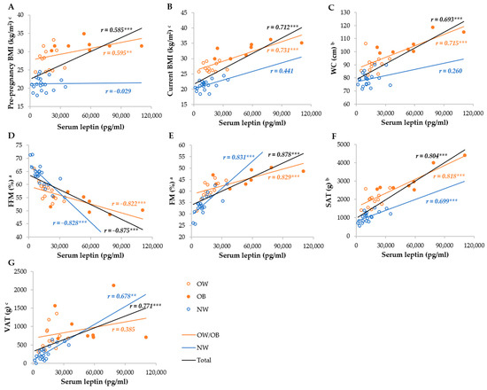 Correlation between serum leptin and anthropometric parameters among NW and OW/OB mothers. BMI, body mass index; FFM, fat-free mass; FM, fat mass; NW, normal weight; OW/OB, overweight or obese; SAT, subcutaneous adipose tissue; WC, waist circumference; VAT, visceral adipose tissue. a Result of the Pearson test conducted on original data; b result of the Pearson correlations conducted on log-transformed data; c results of the Spearman rank correlations. ** p ≤ 0.01; *** p ≤ 0.001. (A) Correlation between serum leptin and pre-pregnancy BMI, (B) correlation between serum leptin and current BMI, (C) correlation between serum leptin and WC, (D) correlation between serum leptin and FFM, (E) correlation between serum leptin and FM, (F) correlation between serum leptin and SAT, and (G) correlation between serum leptin and VAT.