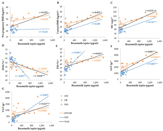 Correlation between breastmilk leptin and anthropometric parameters among NW and OW/OB mothers. BMI, body mass index; FFM, fat-free mass; FM, fat mass; NW, normal weight; OW/OB, overweight or obese; SAT, subcutaneous adipose tissue; WC, waist circumference; VAT, visceral adipose tissue. a Result of the Pearson test conducted on original data; b result of the Pearson correlations conducted on log-transformed data; c results of the Spearman rank correlations. * p ≤ 0.05; ** p ≤ 0.01; *** p ≤ 0.001. (A) Correlation between breastmilk leptin and pre-pregnancy BMI, (B) correlation between breastmilk leptin and current BMI, (C) correlation between breastmilk leptin and WC, (D) correlation between breastmilk leptin and FI (E) correlation between breastmilk leptin and FM, (F) correlation between breastmilk leptin and SAT, and (G) correlation between breastmilk leptin and VAT.