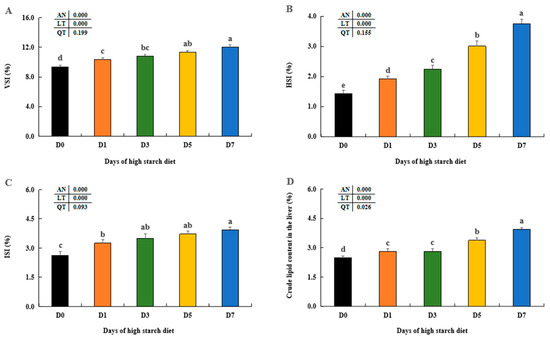 Effect of high-starch diet on body index including VSI (A), HSI (B), ISI (C) and crude lipid content in the liver (D) in largemouth bass. Data are reported as the mean ± SD of three replicates (n = 3). Bars with different superscripts (a–e) are significantly different (p < 0.05). To calculate animal-specific parameters, the following equations were used: hepatosomatic index (HSI, %) = liver weight/final body weight (FBW) × 100. Viscerosomatic index (VSI, %) = viscera weight/FBW × 100. Intestinalsomatic index (ISI, %) = intestinal fat weight/FBW × 100.