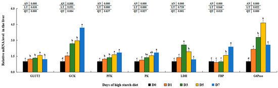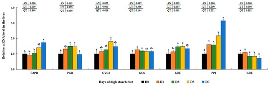 Compared to the D0 groups, amounts and activities of GLUT2, GCK, PFK, PK, LDH, PEPC, and ACC were all notably heightened in the livers of D3, D5, and D7 groups fed with high-starch diet (p < 0.05) and reached maximal levels in D5 or D7 groups, respectively. The contents of PA and LA were also notably heightened in the livers of D1–D7 groups fed with a high-starch diet (p < 0.05), although decreased in the D7 groups when compared with their peak in D5 and D3 groups (p < 0.05), respectively. In addition, activities of FBP, G6Pase, GCS, GBE, and FAS were first increased in D3 or D5 treated groups (p < 0.05) and then decreased in D7 groups. However, activities of GDE were significantly reduced in the D1–D7 groups when compared with D0 groups (p < 0.05), although there were no differences between the D1–D3, and the D5–D7 groups. While, LAG contents were increased in D1–D7 groups and reached the maximal level in the D7 groups (p < 0.05). Although there was no significant variation among the D0, D1, and D3 groups (p > 0.05), Ac-CoA contents were increased in D5 and D7 groups (p < 0.05). Moreover, there were similar variable patterns in the contents of Mal-CoA and LTAG. Compared to the D0 groups, the maximal contents of Mal-CoA and LTAG were both shown in the D5 groups, although no significant variation could be observed between the D5 and D7 groups (p > 0.05) (Table 5).