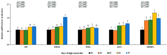 Furthermore, there were rising trends in the levels of insulin receptor (ISR), insulin receptor substrate 2 (ISR2b), serine/threonine kinase 1 (AKT1), and sterol regulatory element binding protein 1c (SREBP1c) observed in the livers of subjects on high-starch diets (p < 0.05). In addition, the levels of PIK3c were significantly higher in the D5 groups compared to the D0 groups (p < 0.05), with no statistical differences observed among the latter (p < 0.05). The highest levels of SREBP1c were shown in the D5 groups compared to those in the other four groups, although there were no statistical differences observed among D1, D3, and D7 groups (p > 0.05) (Figure 4).