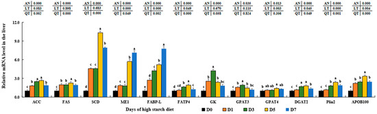 Effect of high-starch diet on related mRNA levels of hepatic lipid metabolism in largemouth bass. Data are reported as the mean ± SD of three replicates (n = 3). Bars with different superscripts (a–e) are significantly different (p < 0.05).