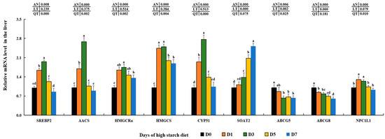 Effect of high-starch diet on related mRNA levels of hepatic cholesterol metabolism in largemouth bass. Data are reported as the mean ± SD of three replicates (n = 3). Bars with different superscripts (a–d) are significantly different (p < 0.05).