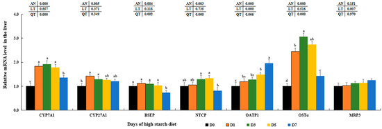 Effect of high-starch diet on related mRNA levels of hepatic bile acid metabolism in largemouth bass. Data are reported as the mean ± SD of three replicates (n = 3). Bars with different superscripts (a–d) are significantly different (p < 0.05).