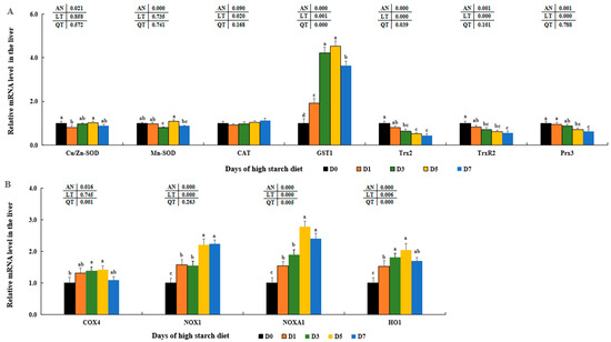 The expressions of Cu/Zn superoxide dismutase (Cu/Zn-SOD) and manganese superoxide dismutase (Mn-SOD) were initially reduced to a minimum in the D1 and D3 groups compared to the D0 control groups (p < 0.05), respectively, both followed by an increase in the D5 groups (p < 0.05) and then were reduced in the D7 groups. There were no significant differences in the transcription levels of CAT in the D0–D7 groups (p > 0.05). Furthermore, GST1 transcriptions were notably elevated in the D3 and D5 groups compared to the D0 group, reaching its peak in the D3 and D5 groups (p < 0.05), with no significant differences between these two groups (p > 0.05). In contrast, the expressions of thioredoxin 2 (Trx2), thioredoxin reductase 2 (TrxR2), and peroxiredoxin 3 (Prx3) were decreased as high-starch feeding increased compared to the D0 groups (p < 0.05) (Figure 8A). The livers of largemouth bass fed a high-starch diet showed increased transcription variations of cytochrome c oxidase 4 (COX4), NADPH oxidase 1 (NOX1), NADPH oxidase activator 1 (NOXA1), and heme oxygenase 1 (HO1), reaching their peaks in the D5 and/or D7 groups compared to those in the D0 groups (p < 0.05). Furthermore, there were no significant variations in COX4 levels among D0, D1, and D7 groups. There were no notable variations in HO1 transcription levels between the D5 and D7 treated groups (p > 0.05) (Figure 8B).