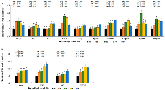 In the livers of largemouth bass fed high starch, TNF-α contents were constantly heightened and peaked in the D7 treated groups compared to the D0 control groups (p < 0.05). There were similar variation trends in the levels of IL-6, IL-8, IL-17, and IL-1β in the D1–D7 groups and were notably higher than those in the D0 control groups (p < 0.05). IL-6 contents were firstly heightened and peaked in the D3 treated groups compared to the D0 groups (p < 0.05). Similarly, contents of IL-8, IL-17, and IL-1β were also firstly heightened and all reached the maximum in the D5 treated groups compared to those in the D0 groups (p < 0.05). Contents of IL-12 in high-starch groups were notably higher than that in the D0 groups, although there were no differences among the D1–D7 treated groups (p > 0.05). IFN-γ levels were notably increased in the D5 and D7 groups compared with those in D0, D1, and D3 treated groups (p < 0.05), while there were no significant differences among the D0, D1, D3 groups and between the D5, D7 groups (Table 7).