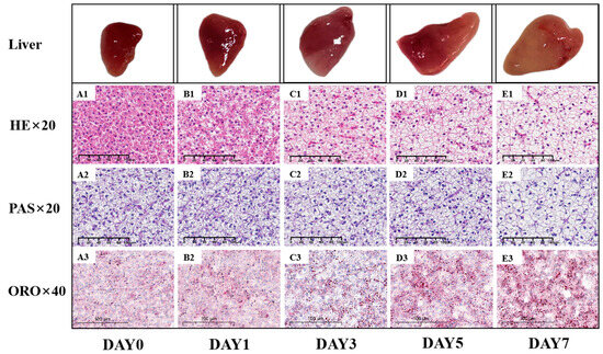 The liver samples of juvenile largemouth bass in the high-starch group (B–E) and the control group (A) were observed by photographing, hematoxylin-eosin staining (HE), periodic acid-Schiff staining (PAS), and Oil Red O staining (ORO) (Figure 10). Within the D0 category (A1–A3), the livers of the largemouth bass displayed a reddish hue and no apparent abnormal characteristics, featuring well-formed hepatocytes with distinct nuclei. Additionally, the glycogen granules and lipid droplets in the liver cells of the largemouth bass were both smaller and of a lighter shade. Within the D1 groups (B1–B3), there were instances of pale livers displaying a dense nuclear phenotype and indistinct liver cords, often indicating the early stages of liver fibrosis in clinical settings. Additionally, there was an increase in glycogen granules and lipid droplets. In D3 (C1–C3), D5 (D1–D3), and D7 (E1–E3) groups, the white areas in the livers of largemouth bass increased and the shape became larger, and glycogen granules and lipid droplets were increased with culturing times with the high-starch diet.