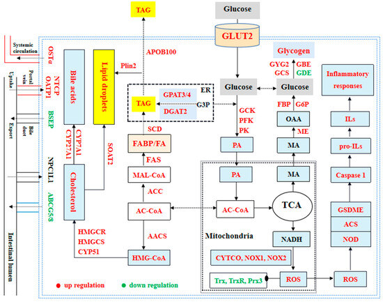 In general, bile acid synthesis is mainly regulated by two key rate-limiting enzymes (CYP7A1 and CYP27A1) mediating the oxidation of cholesterol in hepatocytes [120,121]. Higher CYP7A1 and CYP27A1 levels in D1–D3 groups indicated high starch could induce bile acid synthesis via the oxidation of cholesterol in hepatocytes of largemouth bass. The reduced levels of CYP7A1 and CYP27A1 in D5–D7 groups might be caused by the negative feedback regulatory mechanism mediated by higher TBA contents in hepatocytes [121,122]. Furthermore, liver bile acids may be moved into the bile canaliculus using the bile salt transporter known as the canalicular bile salt export pump (BSEP) [123,124]. Although there were no marked differences among D0–D5 groups, lower BSEP levels in D7 groups indicated high starch might block the transportation of hepatic bile acids into bile canaliculus and then result in possible cholestasis [120,121]. Two important transporting polypeptides, NTCP and OATP1, facilitate the absorption of bile acids from the portal vein into hepatocytes [125]. Higher NTCP and OATP1 levels in D1–D5 groups indicated that bile acids could be taken up into hepatocytes induced by high starch, which might further aggravate cholestasis in largemouth bass. In humans and rodents, studies have found higher levels of hepatic OST-α could help bile acid excretion into the circulating system [122,126]. Combined with higher OST-α mRNA levels and serum TBA contents, it indicated that high starch could drive bile acid excretion into the circulating system via a heightening expression of hepatic OST-α in largemouth bass, although this driving mechanism needed to be studied in fish species [127].