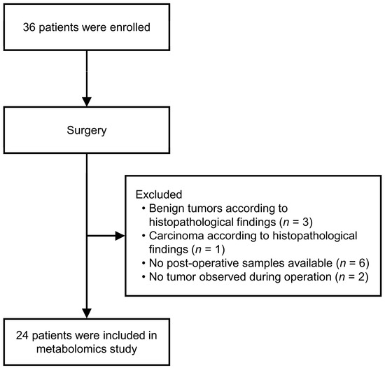 This was a prospective study that enrolled 36 patients who underwent surgical resection of STS from November 2018 to September 2021 at Pusan National University Hospital. Blood samples were collected from subjects before and after the operation. The collected blood samples were centrifuged for 10 min each and then immediately stored frozen at −70 °C. Patients who did not meet the inclusion criteria were excluded, including cases where benign tumors were diagnosed based on histopathological findings (n = 3), cases where carcinoma was confirmed pathologically with surgical specimens (n = 1), cases where post-operative samples were not collected (n = 6), and cases where no tumor was visible during surgery (n = 2) (Figure 1).
