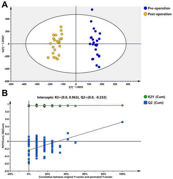 The pre-operative and post-operative plasma samples were analyzed using untargeted metabolomics profiling. The quality control samples were clustered together in the PCA score plot, and there was a slight separation observed between pre-operative and post-operative samples, although it was not very clear (Figure 2). The OPLS-DA score plot clearly differentiated between pre-operative and post-operative STS samples, with an R2Y value of 0.971 and a Q2 value of 0.519 (Figure 3A). In the permutation test to validate the OPLS-DA model, the y-intercept of the R2 and Q2 regression lines were 0.963 and −0.232, respectively (Figure 3B).
