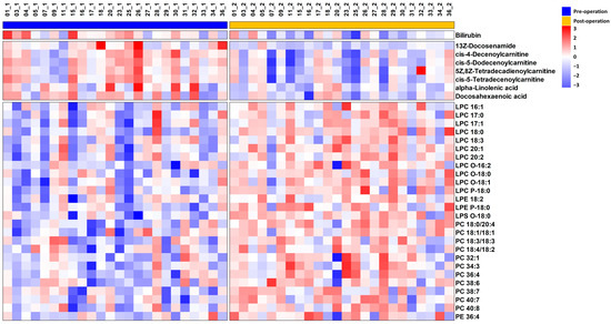 The heatmap of 34 metabolites exhibiting significant alterations between pre-operative and post-operative STS patients.