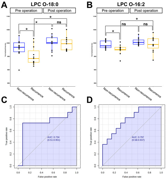 Univariate analysis-based predictive potential of LPC O-18:0 and LPC O-16:2 in distinguishing between recurrence and non-recurrence STS patients at the pre-operative stage. (A,B) Box plots representing the levels of LPC O-18:0 and LPC O-16:2. (C,D) Univariate ROC analysis for LPC O-18:0 and LPC O-16:2, presenting the AUC and 95% confidence interval. *, p < 0.05; ns, not significant.