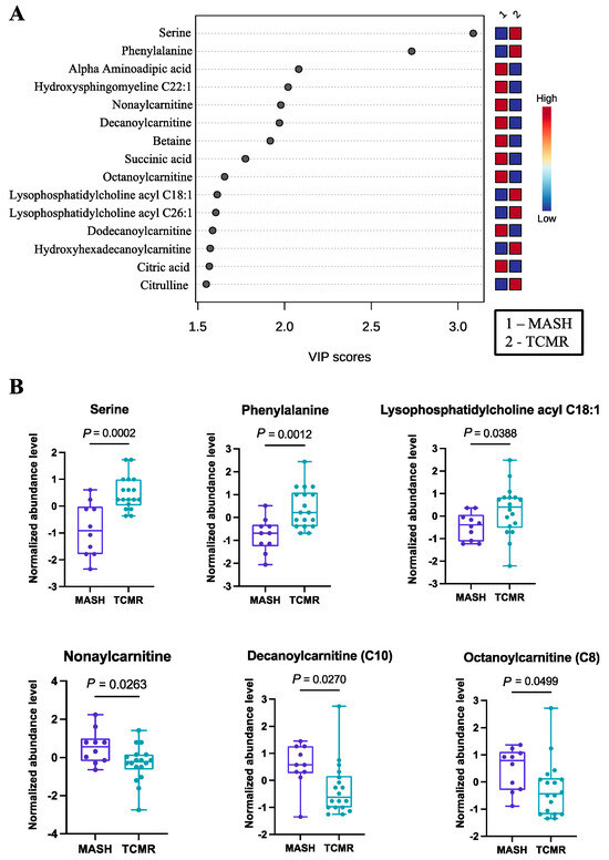 Employing PLS-DA, we identified 40 important metabolites, as documented in Table S1. The PLS-DA plot, as well as the top 15 features, are graphically depicted in Figure 1A. Among these significant metabolites, several amino acids (serine, phenylalanine, alpha aminoadipic acid) and cholines (lysophosphatidylcholine acyl C18:1, lysophosphatidylcholine acyl C26:1) exhibited higher abundance in TCMR patients. Each of these amino acids have either been implicated in immune modulation or as biomarkers of steatohepatitis, in some cases both [30,31,32,33]. Serine deficiency, for example, has been repeatedly identified as a biomarker of MASH in non-transplant populations, and seems to also have a well-defined role in T-cell responses [34].