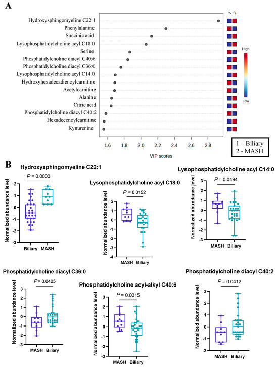 Significant metabolites by MASH vs. Biliary group comparison. (A). PLS-DA plot with top 15 VIP metabolites. (B). Boxplots of selected metabolites. p-values were computed by unpaired t-tests applied to normalized data.
