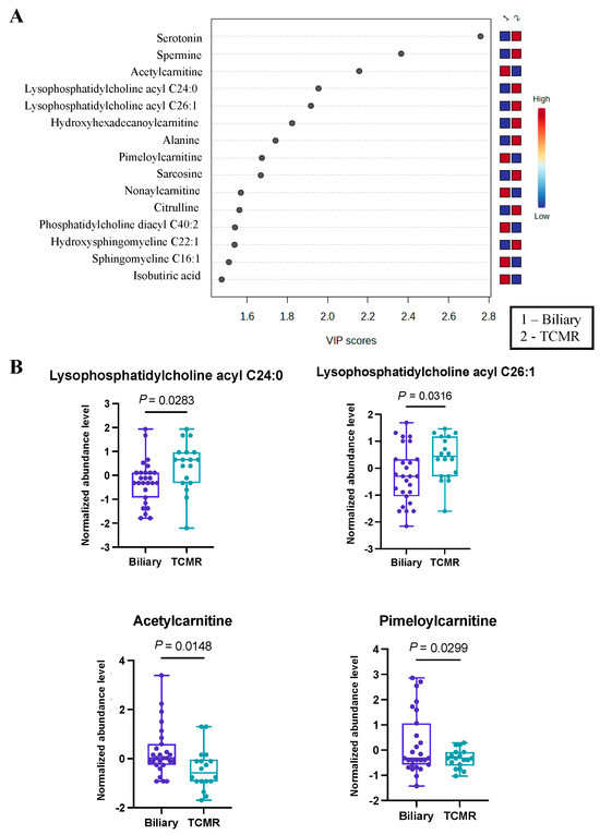 Significant metabolites by TCMR vs. Biliary group comparison. (A). PLS-DA plot with top 15 VIP metabolites. (B). Boxplots of selected metabolites. p-values were computed by unpaired t-tests applied to normalized data.