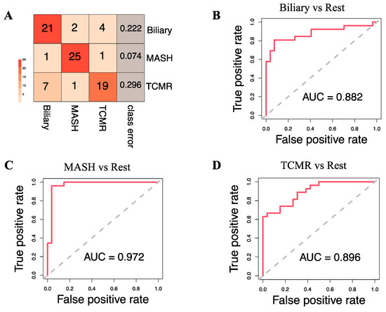 Model Evaluation. (A). Classification results on the Out-of-Bag (OOB) samples. The OOB estimate of the error rate is 19.75% for the 3-way classification model. (B–D) show the Receiver Operating Characteristic (ROC) curve and corresponding Area Under the Curve (AUC) statistics for the following binary models: Biliary vs. Rest, MASH vs. Rest, and TCMR vs. Rest, respectively.